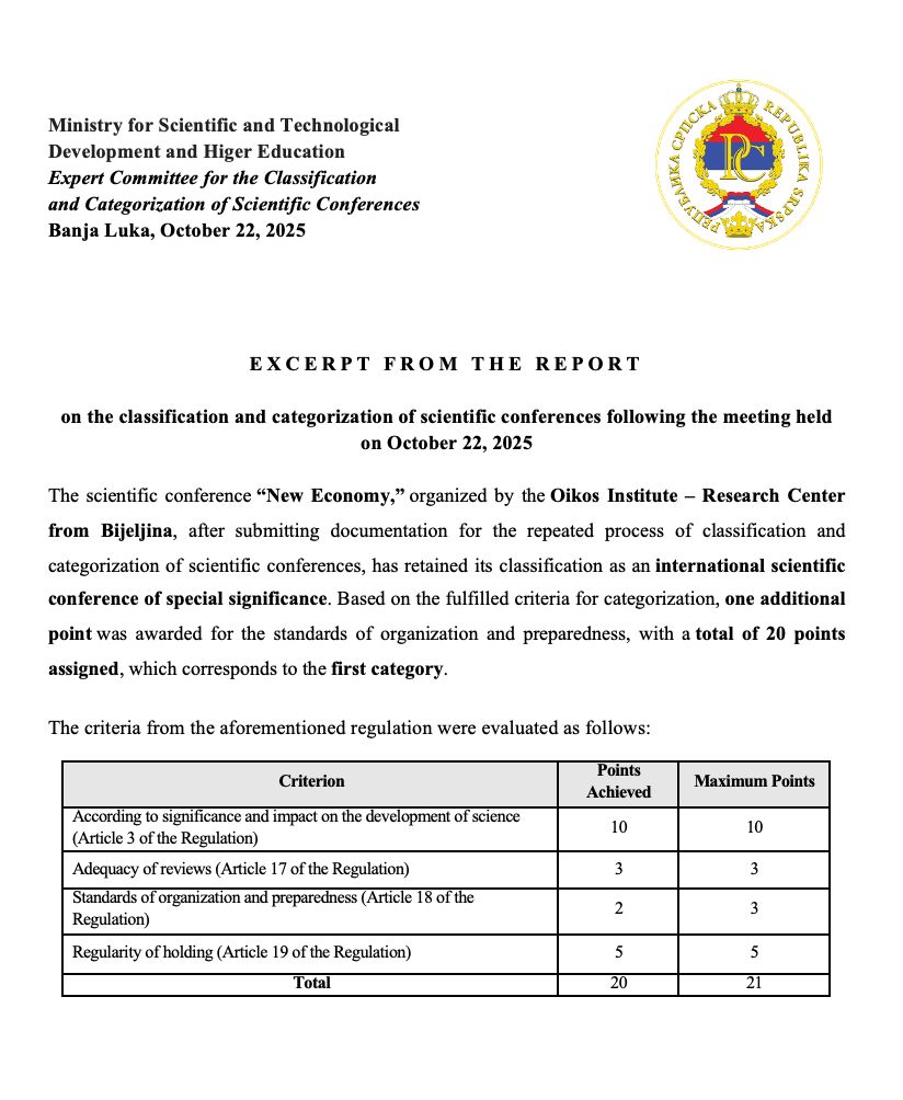 We are pleased to inform the academic community and the public that our 🌐 International Scientific Conference, organized by the Oikos Institute – Research Center Bijeljina, has received 🏅 20 out of a possible 21 points in the latest evaluation conducted by the Ministry of Scientific and Technological Development and Higher Education of the Government of the Republic of Srpska.